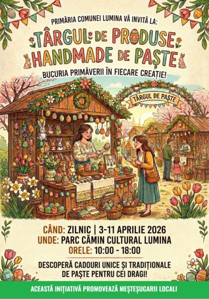Primăria Comunei Lumina invită artizanii, meșterii populari și producătorii de produse handmade să participe la Târgul de Paște 2026, care se va organiza în parcul de lângă Căminul Cultural din comuna Lumina, în perioada 3 – 11 aprilie 2026.