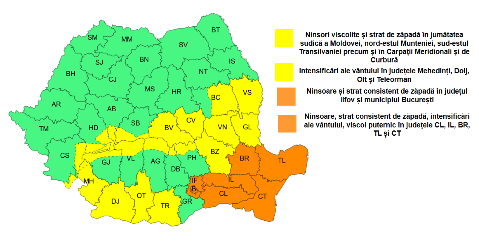 Fenomene vizate: ninsoare, strat consistent de zăpadă, intensificări puternice ale vântului, viscol puternic