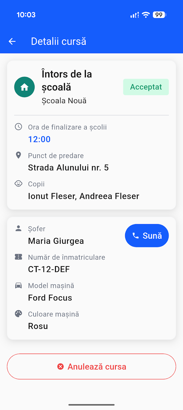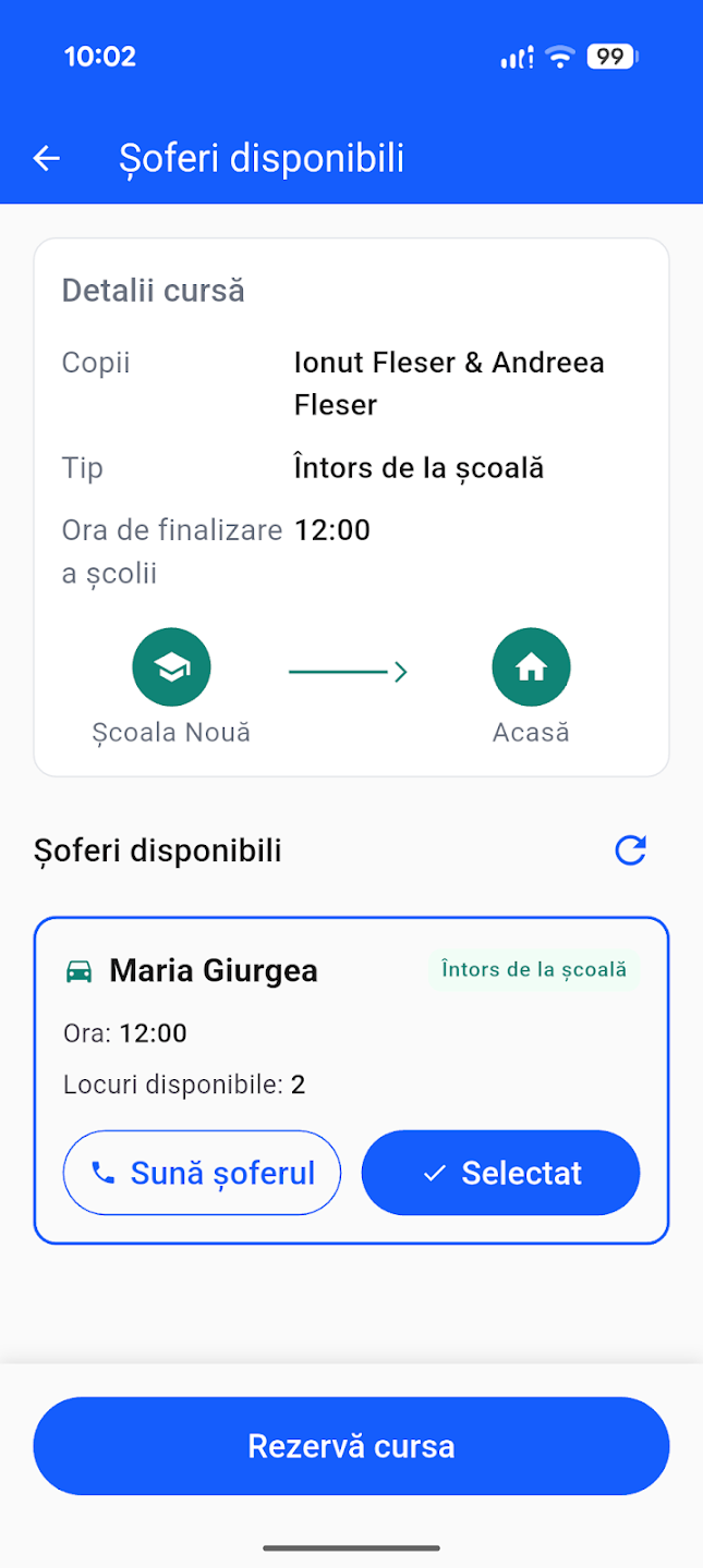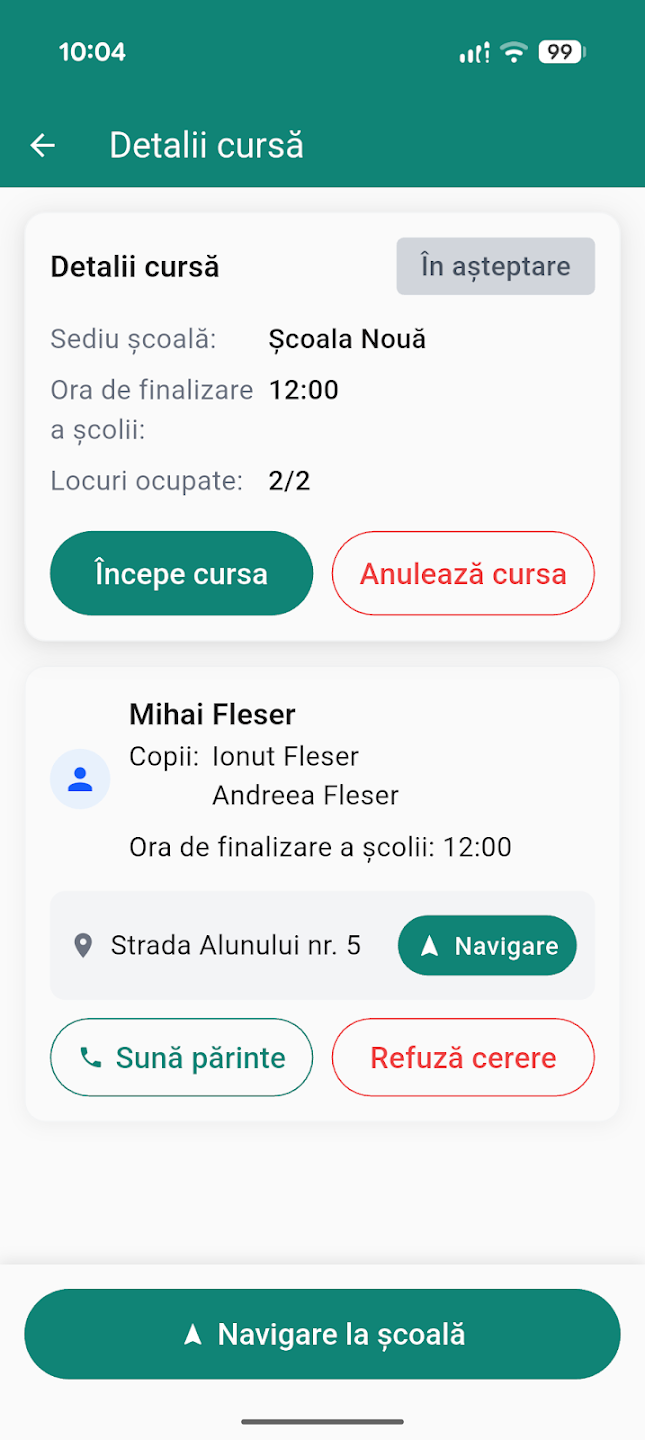 Ca Părinte Pasager: Apăsați „Caută cursă", selectați direcția (Dus/Întors) și trimiteți o cerere șoferului preferat. La acceptare, veți putea urmări locația în timp real.