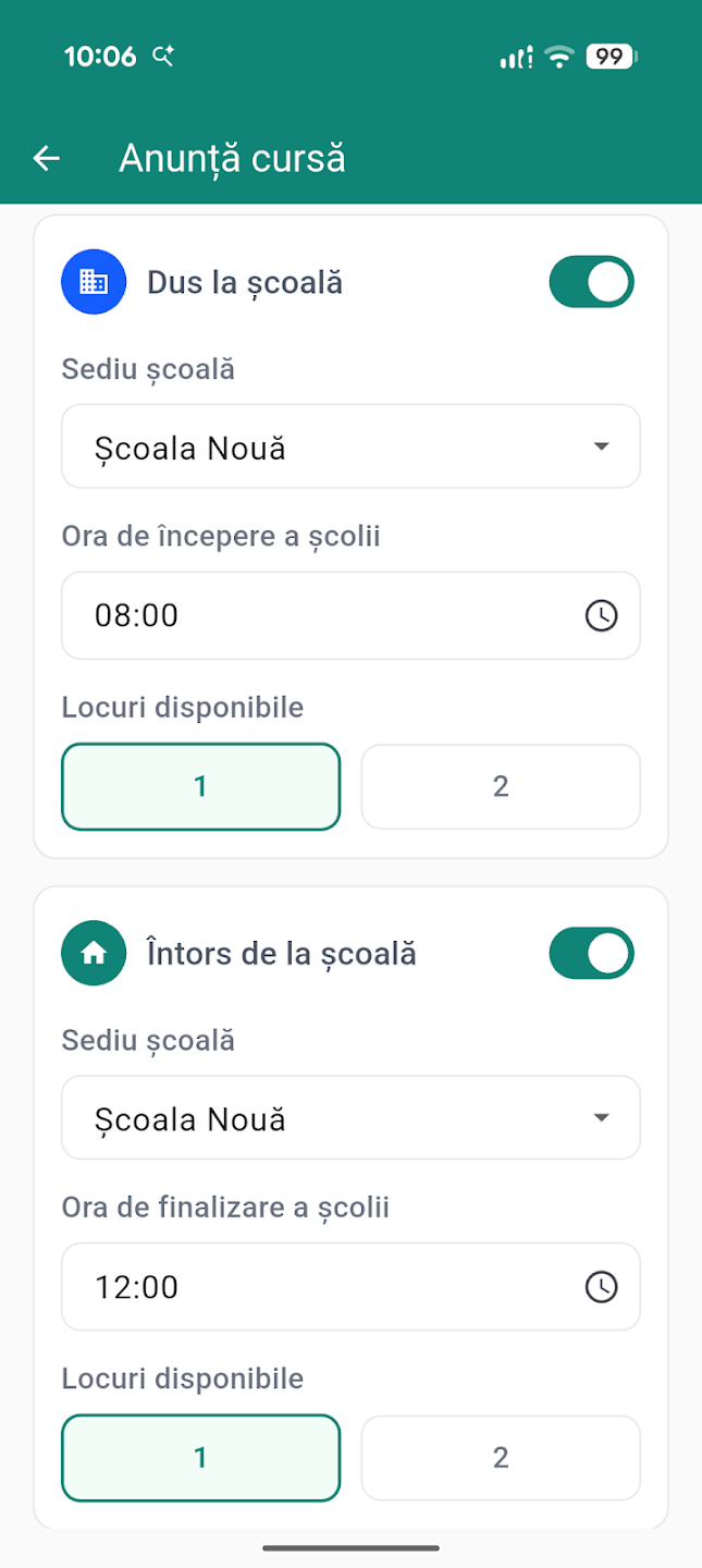 Ca Părinte Șofer: Anunțați o cursă nouă apăsând „Anunță cursă", selectați sediul școlii, ora și numărul de locuri disponibile. Pasagerii vor primi notificări și vă vor urmări pe hartă.