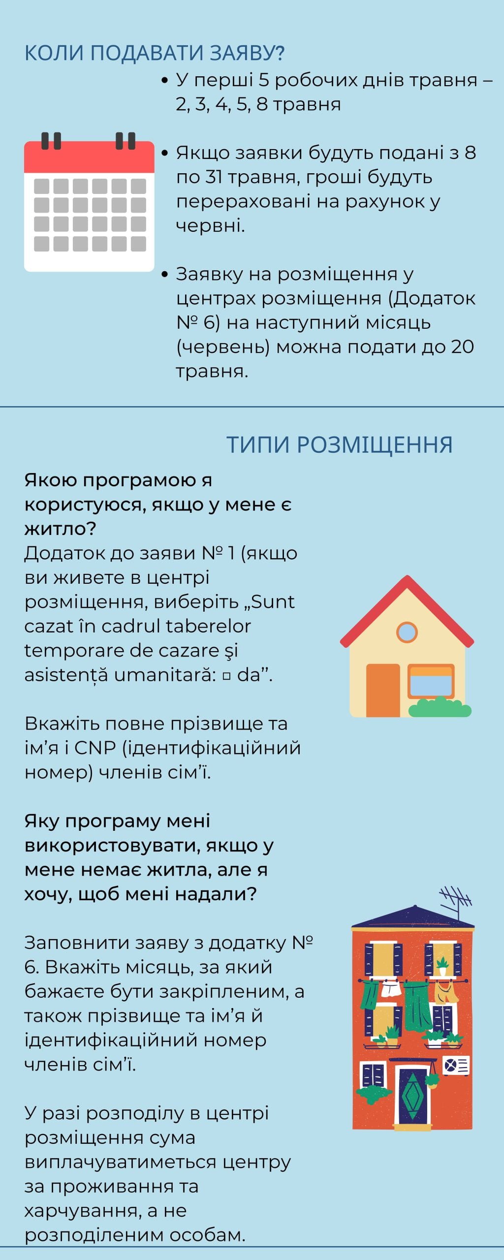 Якщо заявки будуть подані з 8 по 31 травня, гроші будуть перераховані на рахунок у червні. Заявку на розміщення у центрах розміщення (Додаток № 6) на наступний місяць (червень) можна подати до 20 травня.