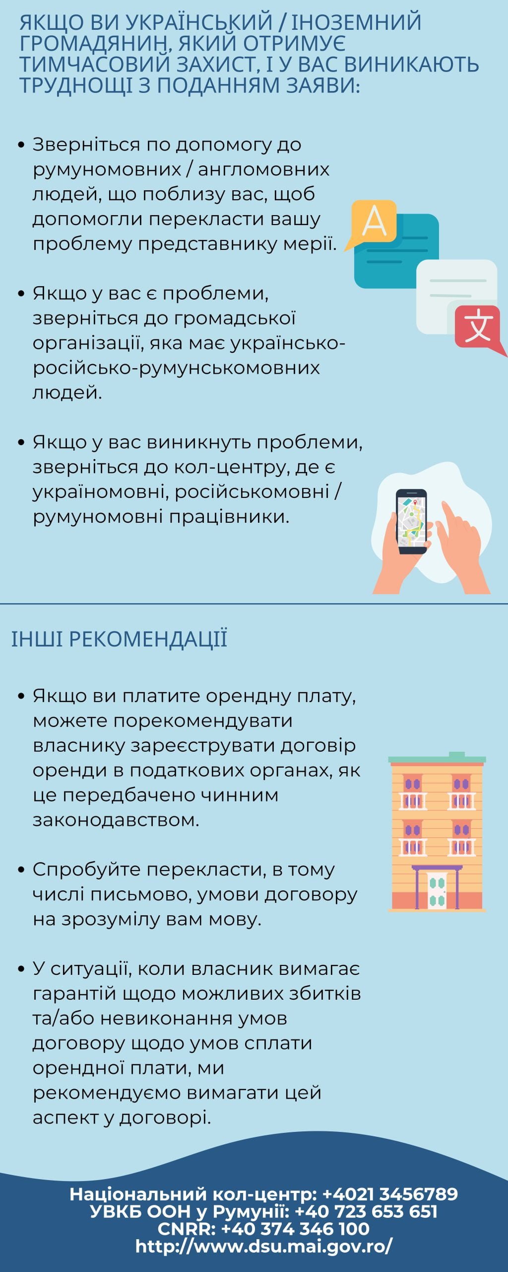 - Якщо у вас є проблеми, зверніться до громадської організації, яка має українсько-російсько-румунськомовних людей.
