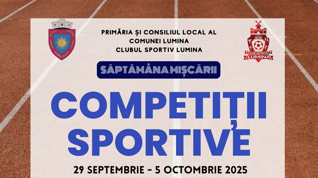 Primăria și Consiliul Local al Comunei Lumina, în parteneriat cu Clubul Sportiv Lumina, organizează în perioada 29 septembrie – 5 octombrie 2025 o serie de activități în cadrul Săptămânii Mișcării, dedicate încurajării unui stil de viață activ și implicării comunității în sport.